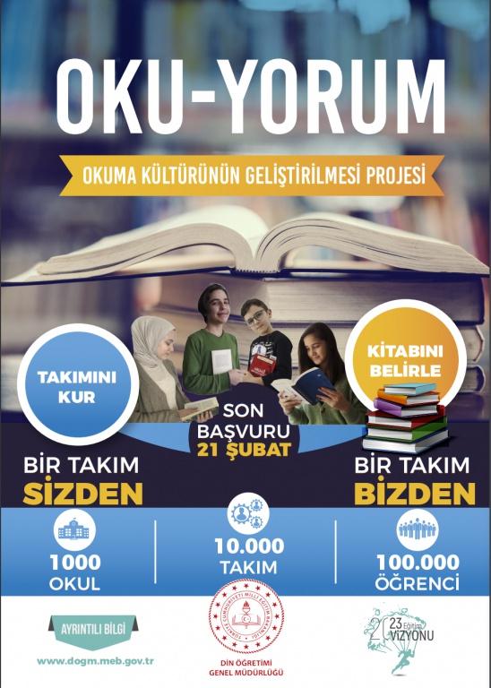 Bu kapsamda Milli Eğitim Bakanlığı Din Öğretimi Genel Müdürlüğü tarafından hayata geçirilerek maddi ve manevi katkıda bulunulan '' OKU-YORUM '' Projesine okulumuz da dahil oldu. Okulumuz da proje kapsamında 5 okuma grubu oluşturulmuş, beş gruba 5 farklı kitap tesbiti yapılmıştır.